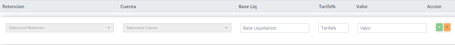- Valor: Es el producto entre la base de liquidacion por el porcentaje de retencion. Tambien se puede ingresar manualmente.